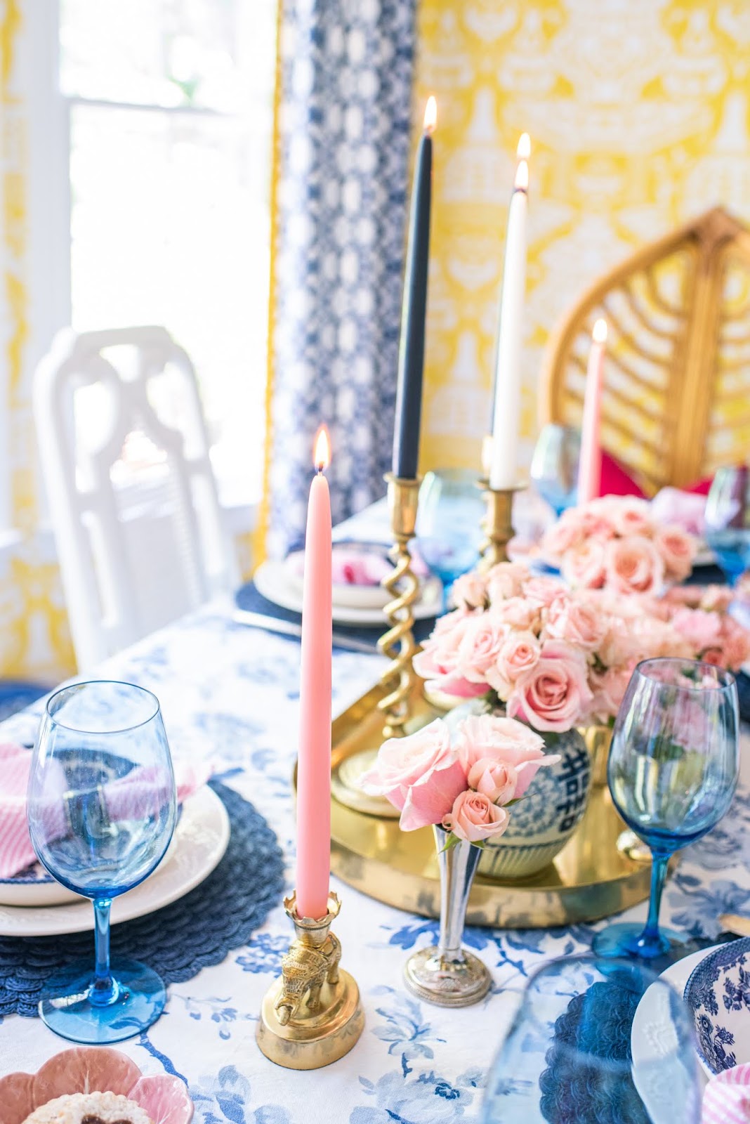 I immediately pulled out the Barely Blush candles and a few of the navy and decided that navy + blush pink was a perfect color palate for Mother's Day. I paired the candles with a blue and white tablecloth and some of my favorite blue bowls, some pink glasses, pink seersucker napkins and some of my silver. I loved it immediately.